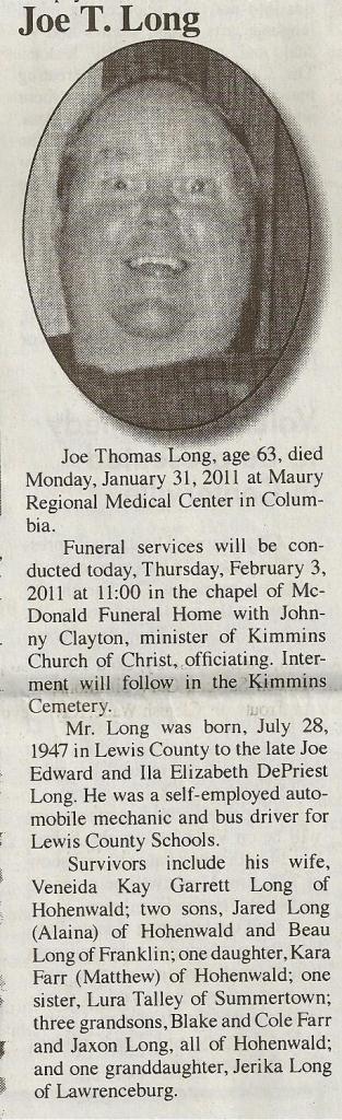 Obituary from Lewis County Herald - 2/3/2011